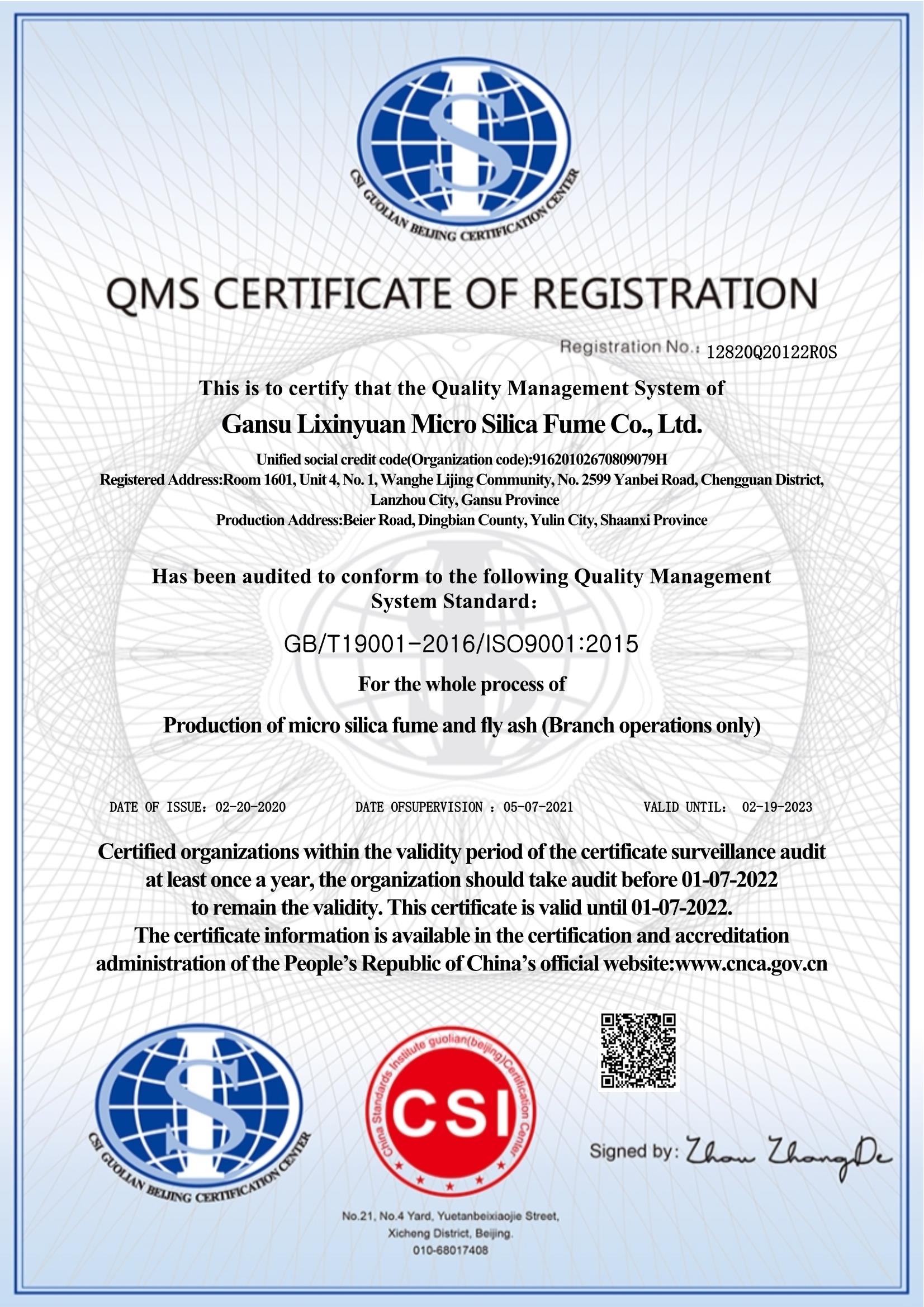 甘肅利鑫源微硅粉有限公司是專業(yè)微硅粉生產(chǎn)加工廠家,從事研發(fā)高品質(zhì)微硅粉,以出口為主的科技型企業(yè)。自2004年以來(lái),公司專做微硅粉十七年。擁有先進(jìn)的生產(chǎn)和化驗(yàn)設(shè)備,并通 過(guò)了ISO9001:2015質(zhì)量管理體系認(rèn)證、ISO145001:2018環(huán)境管理體系認(rèn)證和ISO 45001: 2018職業(yè)健康管理體系認(rèn)證。